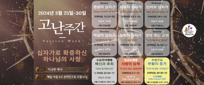 수요예배(3/27)는 저녁 7시에 온라인으로 드리고 성금요예배/성찬식은 3월 29일(금) 오후 7시에 Palm Desert 성전에서 드립니다.
