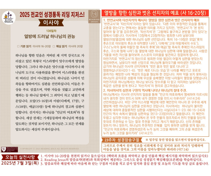 할렐루야! 2025년 전교인성경통독 리딩 지저스 제136일차 말씀은 이사야 16-20장입니다.