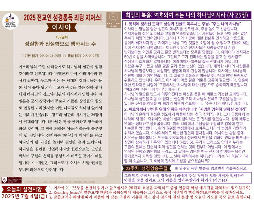 할렐루야! 2025년 전교인성경통독 리딩 지저스 제137일차 말씀은 이사야 21-25장입니다.