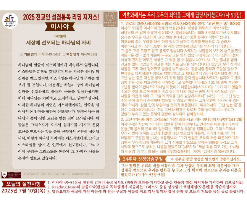 할렐루야! 2025년 전교인성경통독 리딩 지저스 제142일차 말씀은 이사야 49~54장입니다.