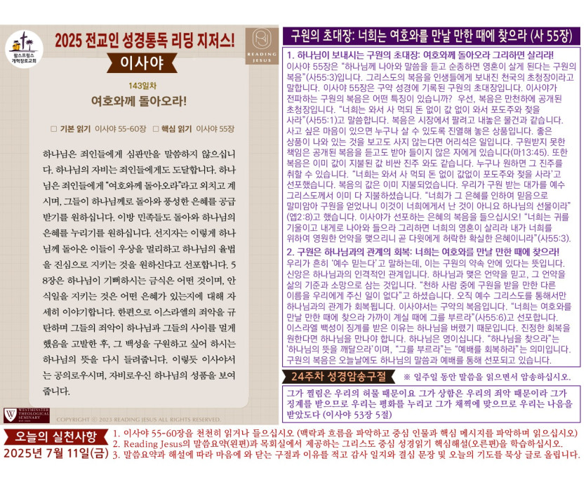 할렐루야! 2025년 전교인성경통독 리딩 지저스 제143일차 말씀은 이사야 55~60장입니다.