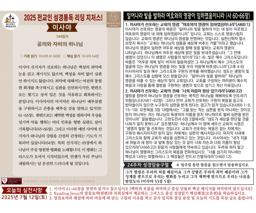 할렐루야! 2025년 전교인성경통독 리딩 지저스 제144일차 말씀은 이사야 61~66장입니다.