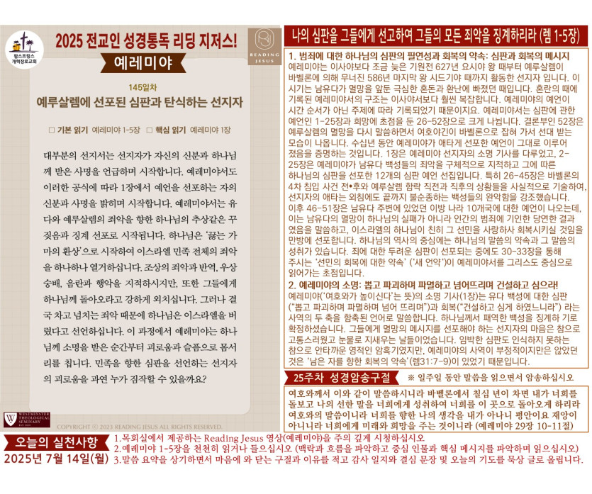 할렐루야! 2025년 전교인성경통독 리딩 지저스 제145일차 말씀은 예레미야 1~5장입니다.