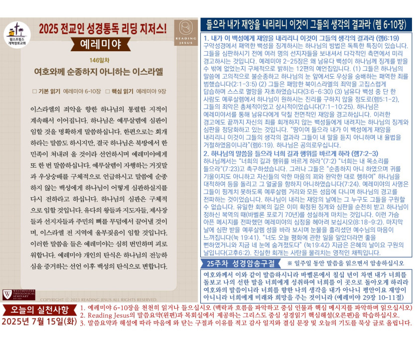 할렐루야! 2025년 전교인성경통독 리딩 지저스 제146일차 말씀은 예레미야 6~10장입니다.