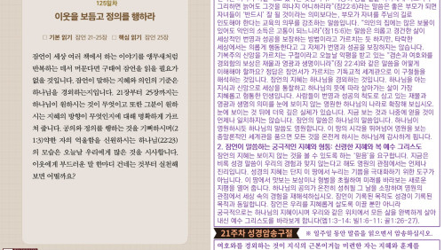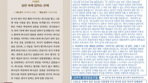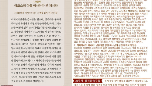 할렐루야! 2025년 전교인성경통독 리딩 지저스 제133일차 말씀은 이사야 1-5장입니다. 이사야서는 남유다를 향한 하나님의 심판과 위로의 말씀입니다. 이사야가 사역했던 시대는 솔로몬 이후의 역사에서 가장 융성한 시기였지만, 백성들과 정치 지도자들의 신앙이 오염되면서, 돌이킬 수 없는 파국을 맞게 되는 시대였습니다. 이사야서는 크게 두 부분으로 나뉘지요? 1장에서 39장은 범죄한 남유다를 향한 하나님의 심판의 메시지이고, 40장에서 66장은 회복과 위로의 메시지입니다. 이사야서의 시작을 보십시오! 남유다의 타락에 대한 하나님의 비탄과 질타가 주된 내용입니다. 선지자를 통한 경고의 말씀에도 남유다는 끊임없이 범죄합니다. 두려운 심판 중에도 놀라운 긍휼을 베푸시는 은혜와 회복의 약속이, 이사야서가 궁극적으로 전파하는 하나님의 구원 역사입니다. 이번주에도 백성을 향하신 하나님의 마음과 사랑을 깨닫는 복된 주간 되시기를 바랍니다.