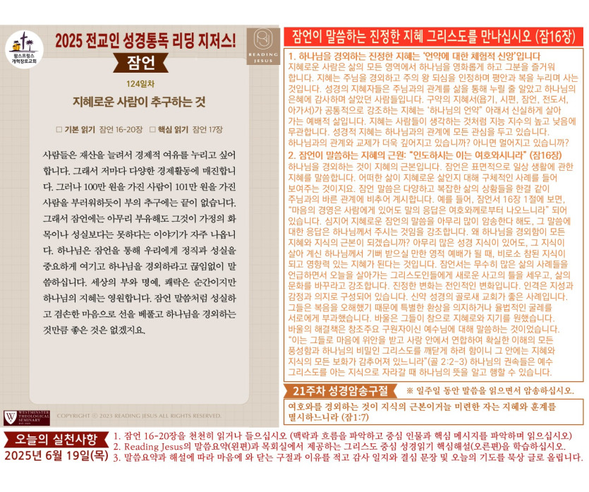 할렐루야! 2025년 전교인성경통독 리딩 지저스 제124일차 말씀은 잠언 16-20장입니다.