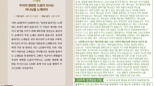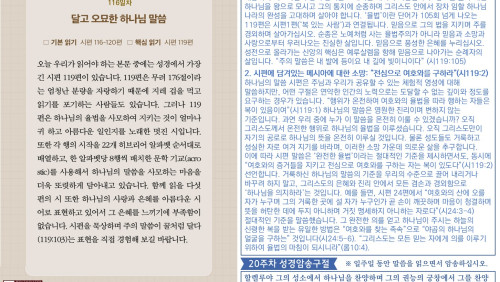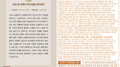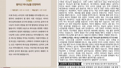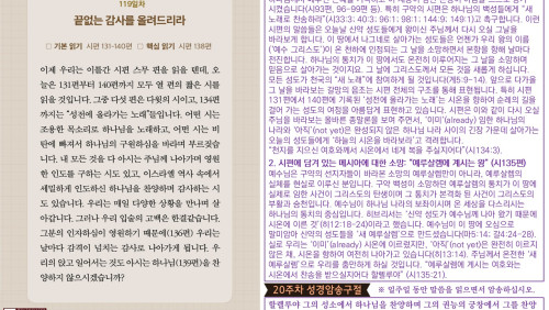 할렐루야! 2025년 전교인성경통독 리딩 지저스 제120일차 말씀은 시편 141-150편입니다. 150편의 시들이 하나의 책으로서 시편(The Psalter)을 이루고 있습니다. 시편은 어느 한 순간 하늘에서 떨어진 노래집이 아니라, 성령의 감동으로 수세기에 걸쳐 기록된 하나님의 말씀입니다. 시편1-2편이 서론으로서 중심 주제(‘하나님의 말씀’과 ‘하나님의 통치’)를 제시합니다. 제1권에서는 말씀을 붙들고 살아가는 의인과 세상의 지혜로 살아가는 악인 사이의 갈등을 심도 있게 조명하며, 제2권에서는 다채로운 삶의 영성으로 ‘비탄’과 ‘인정’과 ‘찬양’ 이라는 시편의 맥을 보여줍니다. 제3권에서, 악인이 심판을 받기는 커녕 오히려 형통한 현실을 보며 절망하기도 하지만, 제4권을 통해 절망을 소망으로 전환시키는 찬양과 기도의 능력을 체험케 합니다. 고난은 믿음을 온전케 합니다. 제5권을 통해 보여 주시는 소망과 확신의 찬양들은 모든 성경이 그러하듯 시편도 예수 그리스도를 영원한 해답으로 제시한다는 사실을 깨닫게 합니다. 포로로 귀환한 이스라엘 백성처럼 우리 역시 하나님의 임재를 믿음으로 누리지 못할 때가 있습니다. 모든 것이 떨어져 나간 듯한 비정상적인 세상에서, 악인이 형통하고 의인이 고통 받는 기가 막힌 웅덩이를 경험합니다. 바른 신앙을 지켜가는 현실의 삶에서 우리도 시인들처럼 좌절하고 한숨을 쉬며 탄식합니다. 시편 전체가 우리에게 가르치는 것은 찬양과 기도야말로 절망과 무감각과 세속화에 대응하는 가장 좋은 방어책 이라는 사실입니다. 시편의 영성은 우선 순위를 재정립 해주고 초점을 나 자신의 문제에서 하나님께로 옮겨 줍니다. 말씀으로 분별하고 예배로 구별됨이 복입니다