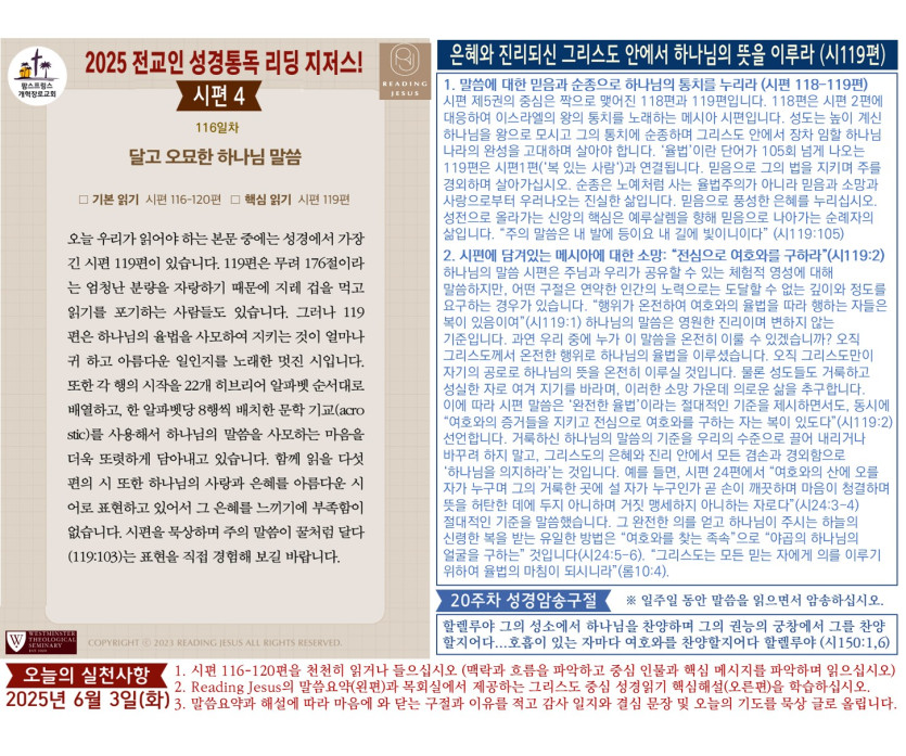 할렐루야! 2025년 전교인성경통독 리딩 지저스 제116일차 말씀은 시편 116-120편입니다.