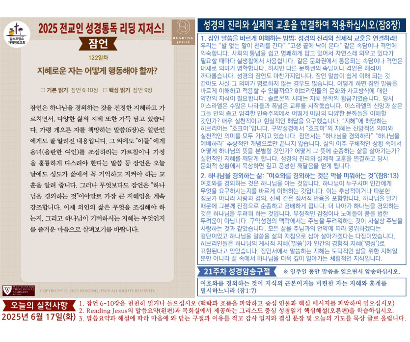 할렐루야! 2025년 전교인성경통독 리딩 지저스 제122일차 말씀은 잠언 6-10장입니다.