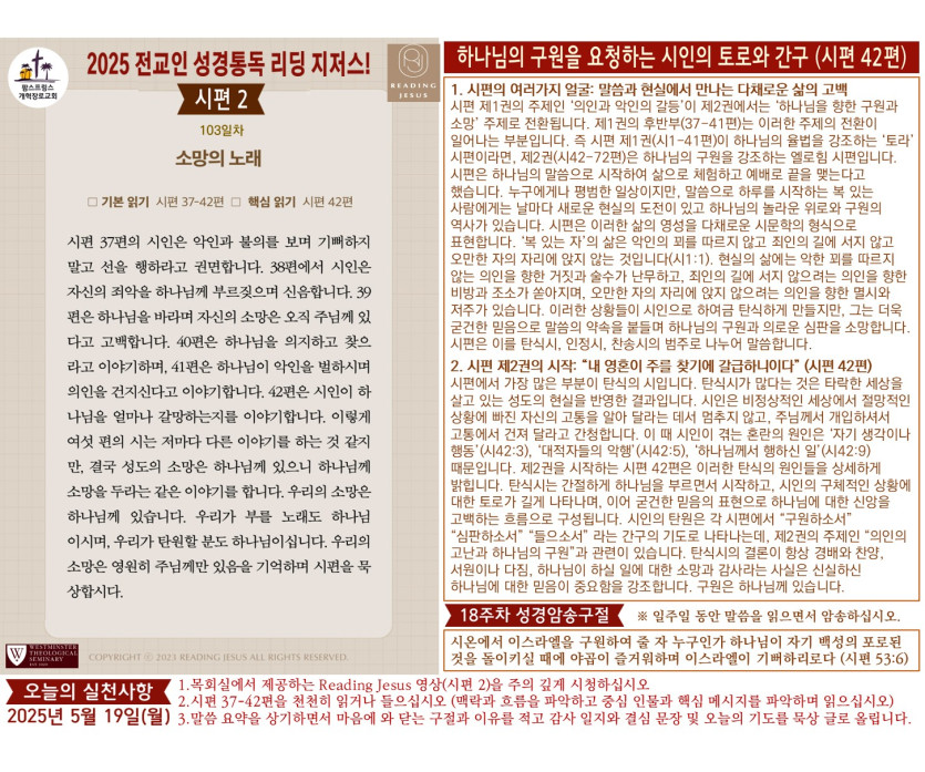 할렐루야! 2025년 전교인성경통독 리딩 지저스 제103일차 말씀은 시편 37-42편입니다.