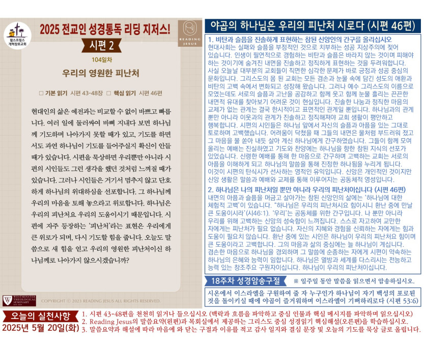 할렐루야! 2025년 전교인성경통독 리딩 지저스 제104일차 말씀은 시편 43-48편입니다.