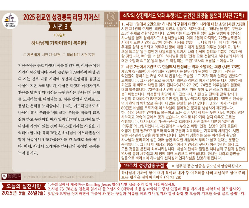 할렐루야! 2025년 전교인성경통독 리딩 지저스 제109일차 말씀은 시편 73-78편입니다.