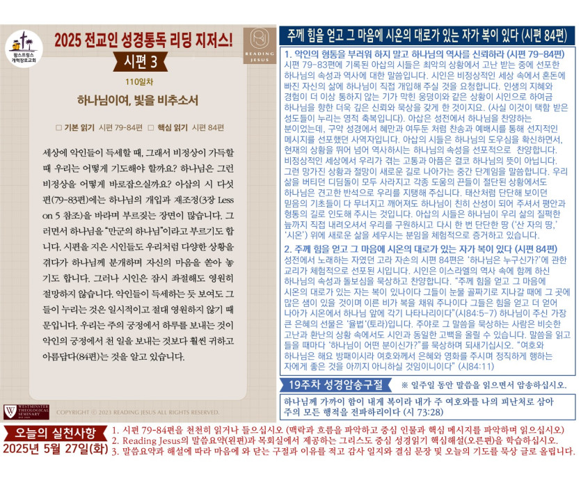 할렐루야! 2025년 전교인성경통독 리딩 지저스 제110일차 말씀은 시편 79-84편입니다.