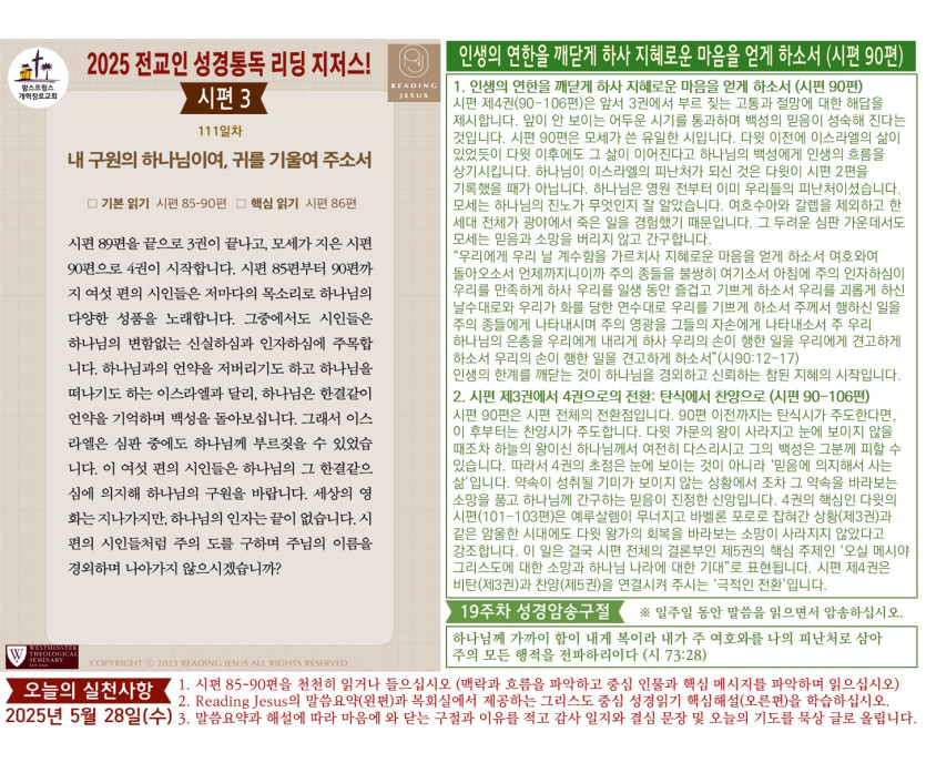 할렐루야! 2025년 전교인성경통독 리딩 지저스 제111일차 말씀은 시편 85-90편입니다.
