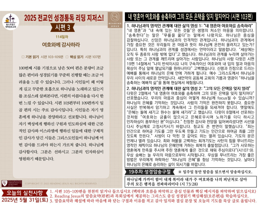 할렐루야! 2025년 전교인성경통독 리딩 지저스 제114일차 말씀은 시편 103-109편입니다.