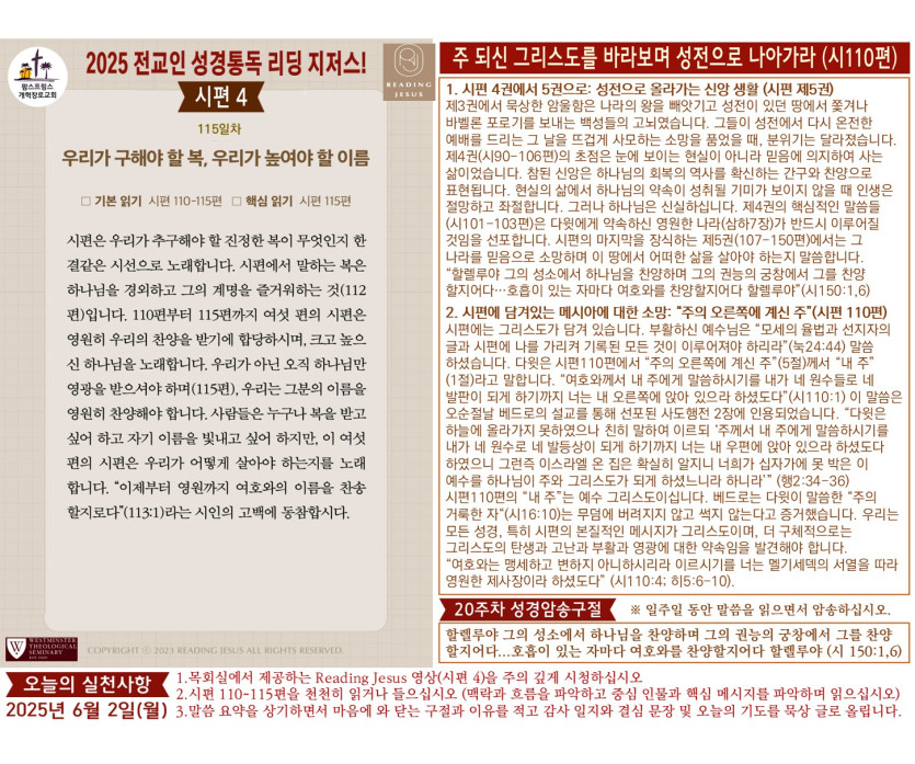 할렐루야! 2025년 전교인성경통독 리딩 지저스 제115일차 말씀은 시편 110-115편입니다.