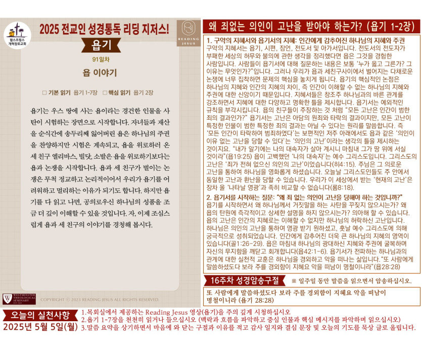 할렐루야! 2025년 전교인성경통독 리딩 지저스 제91일차 말씀은 욥기 1-7장입니다.