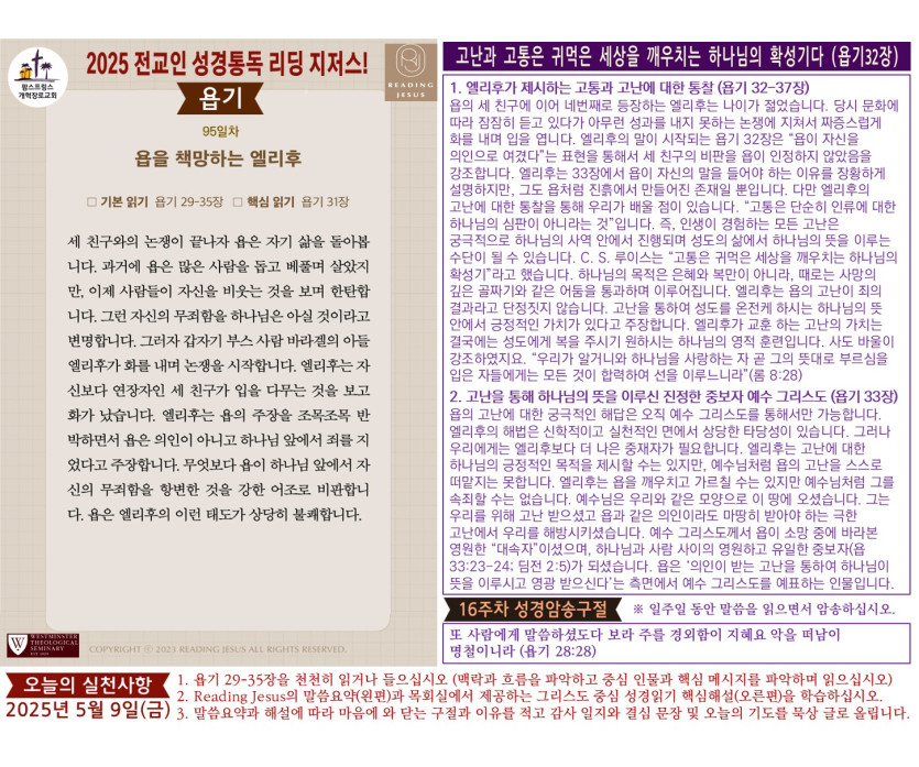 할렐루야! 2025년 전교인성경통독 리딩 지저스 제95일차 말씀은 욥기 29-35장입니다.