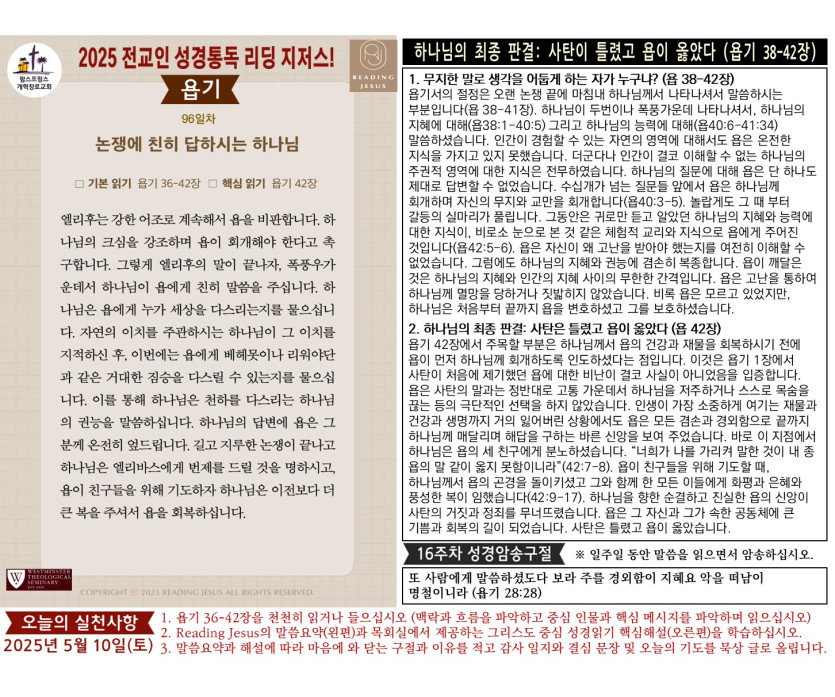 할렐루야! 2025년 전교인성경통독 리딩 지저스 제96일차 말씀은 욥기 36-42장입니다.