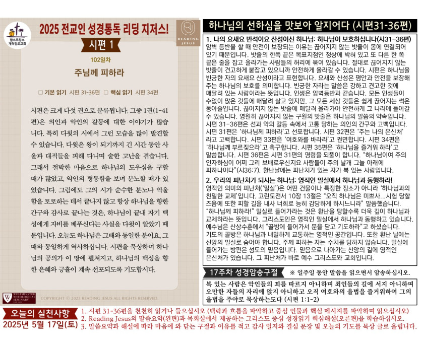 할렐루야! 2025년 전교인성경통독 리딩 지저스 제102일차 말씀은 시편 31-36편입니다.