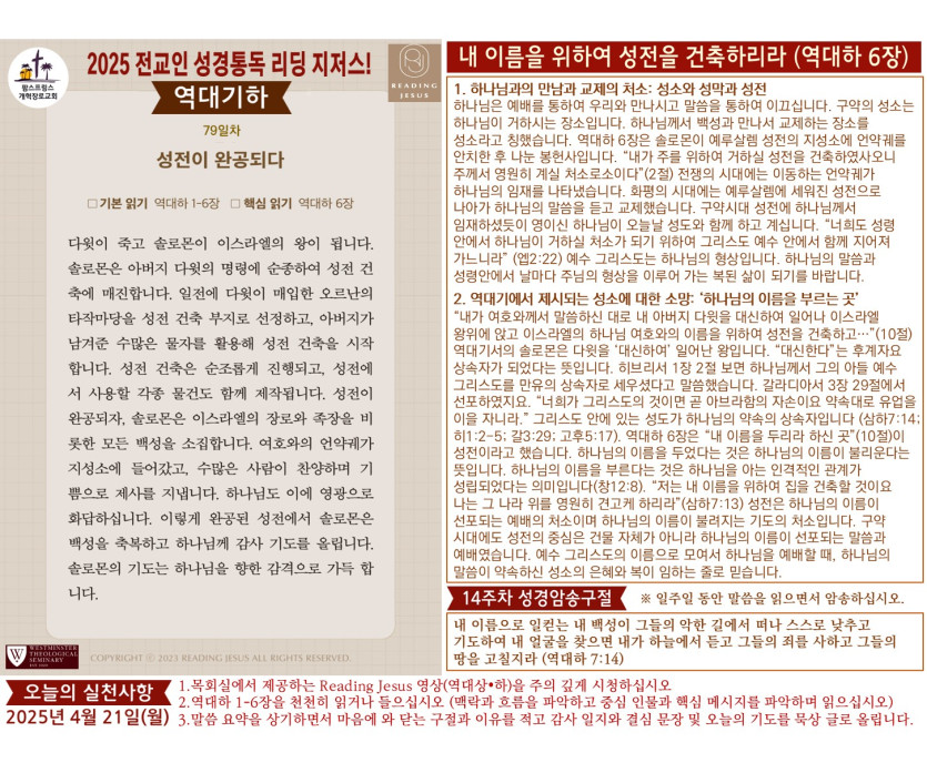 2025년 4월 21일은 역대하 1-6장을 함께 읽고 묵상합니다.