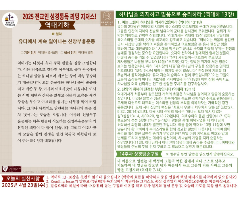 할렐루야! 2025년 전교인성경통독 리딩 지저스 제81일차 말씀은 역대하 13-18장입니다.