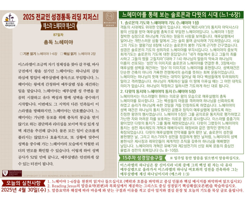 할렐루야! 2025년 전교인성경통독 리딩 지저스 제87일차 말씀 느헤미야 1-6장입니다.