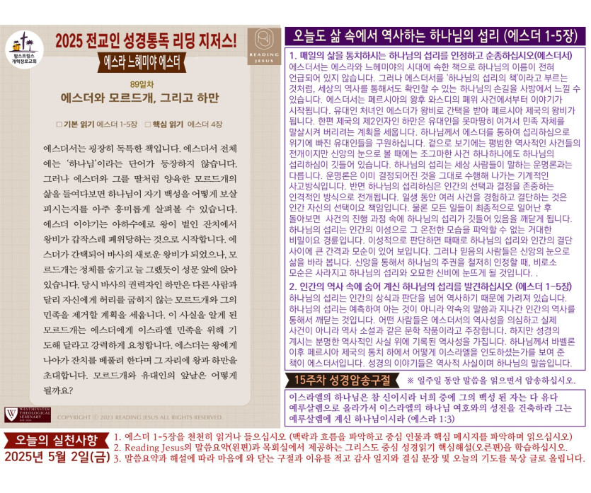할렐루야! 2025년 전교인성경통독 리딩 지저스 제89일차 말씀은 에스더 1-5장입니다.