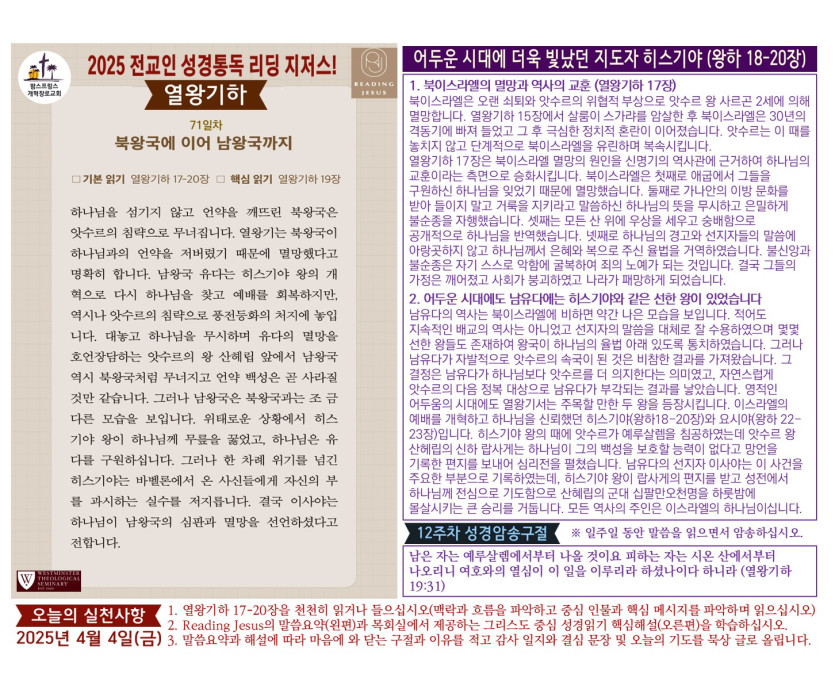 할렐루야! 2025년 전교인성경통독 리딩 지저스 제71일차 4월 4일(금) 말씀은 열왕기하 17-20장입니다.