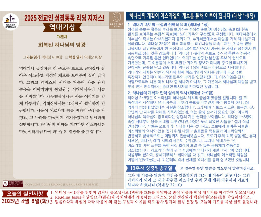 할렐루야! 2025년 전교인성경통독 리딩 지저스 제74일차 4월 8일(화) 말씀은 역대기상 6-10장입니다.