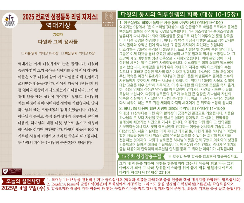 할렐루야! 2025년 전교인성경통독 리딩 지저스 제75일차 4월 9일(수) 말씀은 역대기상 11-15장입니다.