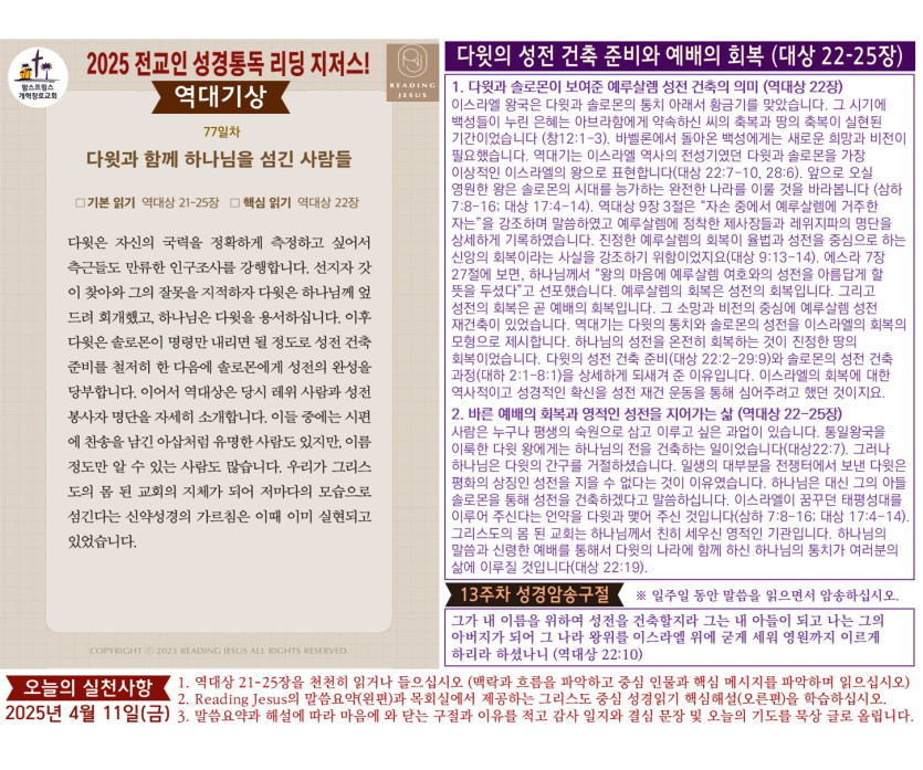 할렐루야! 2025년 전교인성경통독 리딩 지저스 제77일차 4월 11일(금) 말씀은 역대기상 21-25장입니다.