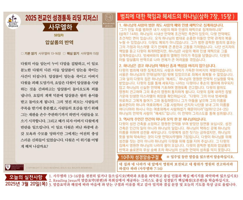 할렐루야! 2025년 전교인성경통독 리딩 지저스 제58일차 3월 20일(목) 말씀은 사무엘하 13-16장입니다.