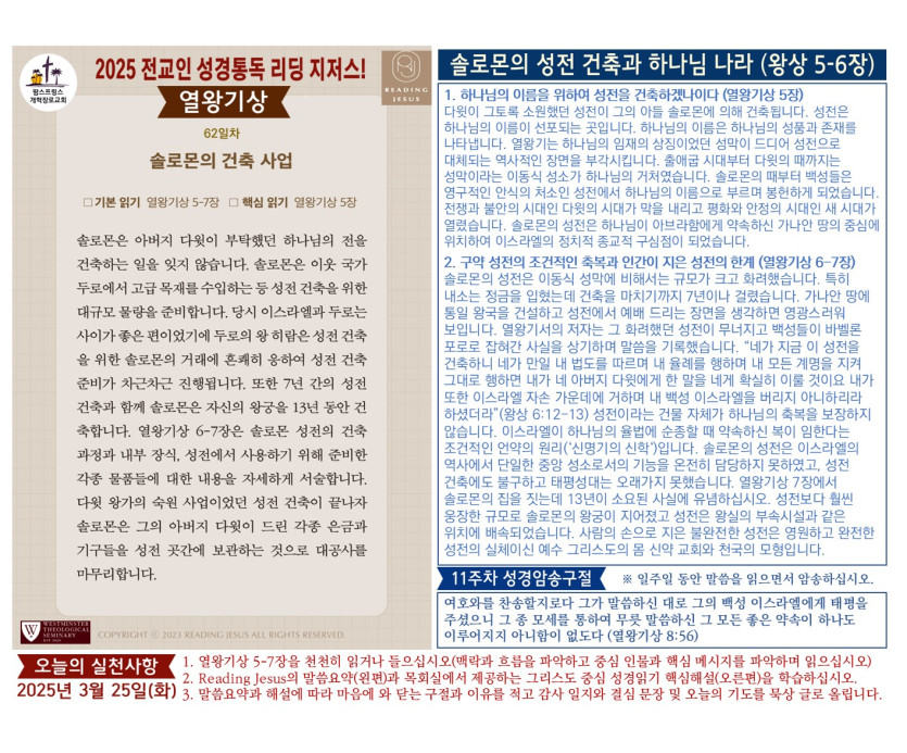 할렐루야! 2025년 전교인성경통독 리딩 지저스 제62일차 3월 25일(화) 말씀은 열왕기상 5-7장을 읽겠습니다.