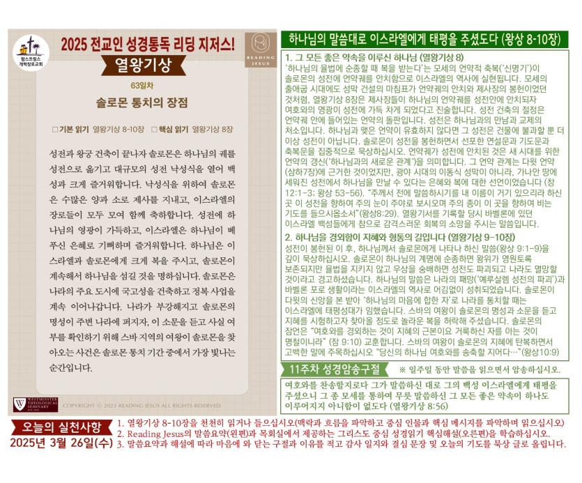 할렐루야! 2025년 전교인성경통독 리딩 지저스 제63일차 3월 26일(수) 말씀은 열왕기상 8-10장입니다.