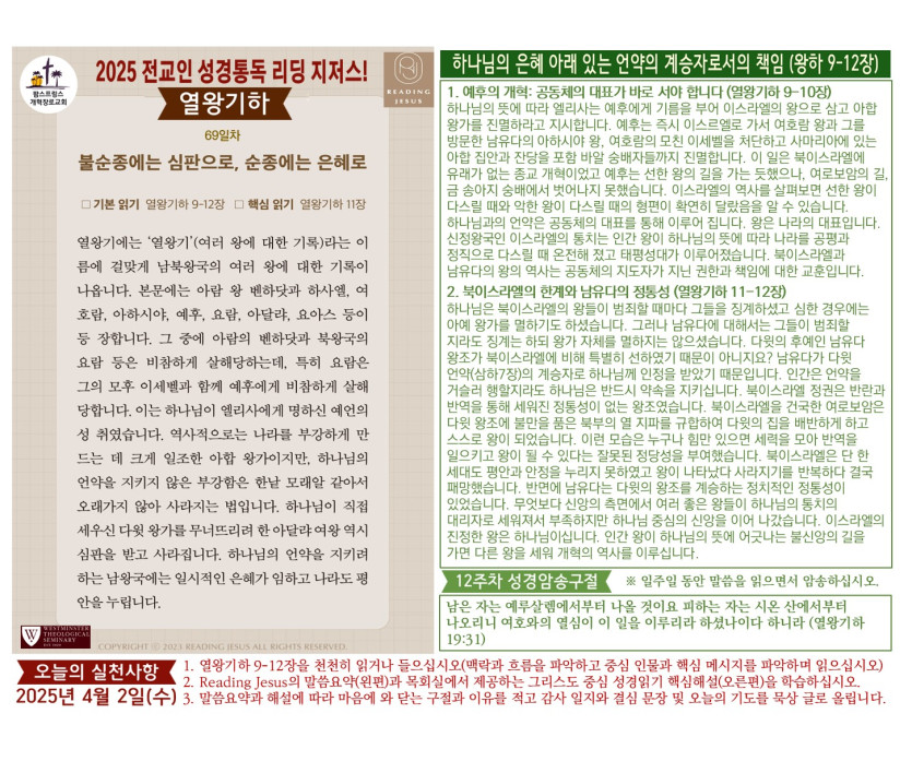 할렐루야! 2025년 전교인성경통독 리딩 지저스 제69일차 4월 2일(수) 말씀은 열왕기하 9-12장입니다.