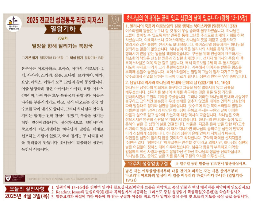 할렐루야! 2025년 전교인성경통독 리딩 지저스 제70일차 4월 3일(목) 말씀은 열왕기하 13-16장입니다.
