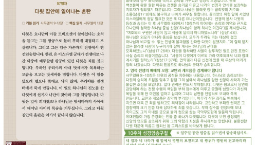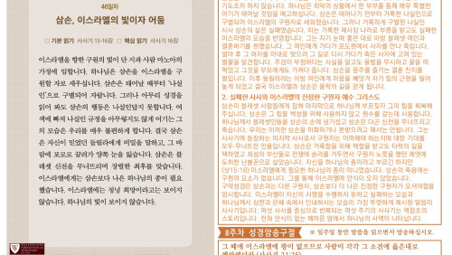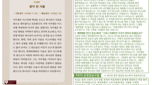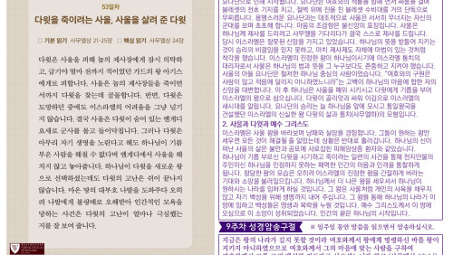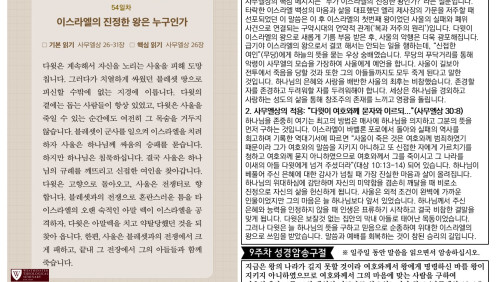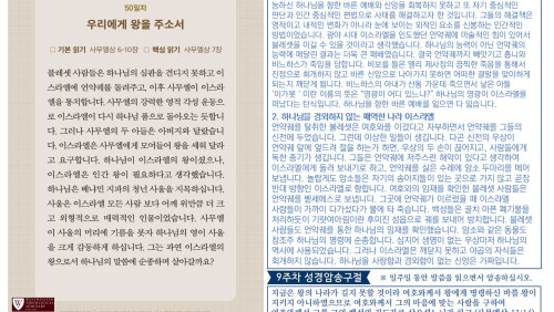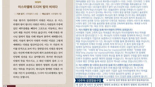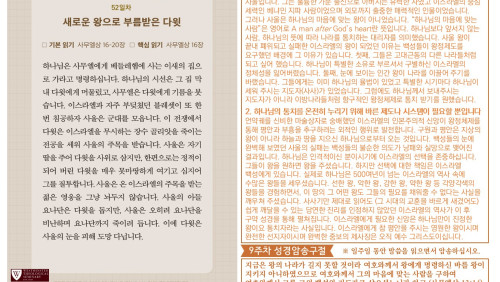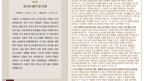 할렐루야! 2025년 전교인성경통독 리딩 지저스 제56일차 3월 18일(화) 말씀은 사무엘하 5-8장입니다. 이스라엘의 왕 다윗을 통해 시내산에서 맺은 언약이 성취됩니다. 다윗이 왕의 직분을 행사하는 과정(시작과 끝)을 살펴 보십시오. (1)다윗은 예루살렘을 성전 짓는 장소로 확보합니다(삼하 5-10장, 24장). (2)다윗은 그 땅에 안식을 가져다 줍니다(삼하 5장, 7장). (3) 다윗이 언약궤를 예루살렘으로 가져 옵니다(삼하 6장). (4)사울의 왕조가 끝이 납니다(삼하 6장). (5)하나님이 다윗의 왕조를 안전케 하십니다(삼하 7장). (6)솔로몬이 성전을 건축합니다 (삼하7:1, 왕상 6장). 이 순서가 암시하는 메시지는 다윗이 통일 왕국을 건설하고 솔로몬의 성전이 지어지는 모든 과정들이 하나님의 통치 체제를 견고히 하는 예루살렘의 건설 사역이었다는 사실입니다. 예루살렘 성전은 하나님의 통치의 중심입니다. 비록 다윗이 성전을 짓지는 않았지만 다윗으로 대표되는 전쟁의 시대 이 후 화평의 시대의 왕인 그의 아들 솔로몬을 통해 성전을 건축하여 봉헌하는 축복을 누리게 하십니다(삼하 7장, 대상 22장, 왕상 5-6장). 오늘도 여러분의 삶을 더욱 견고하게 세워가시는 하나님의 은혜의 손길을 체험하시기 바랍니다. 샬롬!