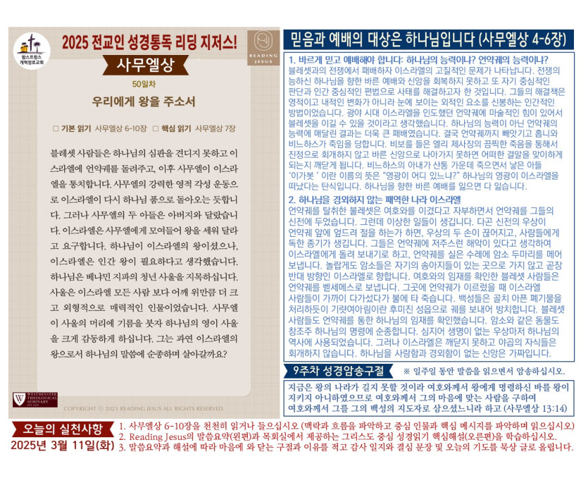 할렐루야! 2025년 전교인성경통독 리딩 지저스 제50일차 3월 11일(화) 말씀은 사무엘상 6-10장입니다.