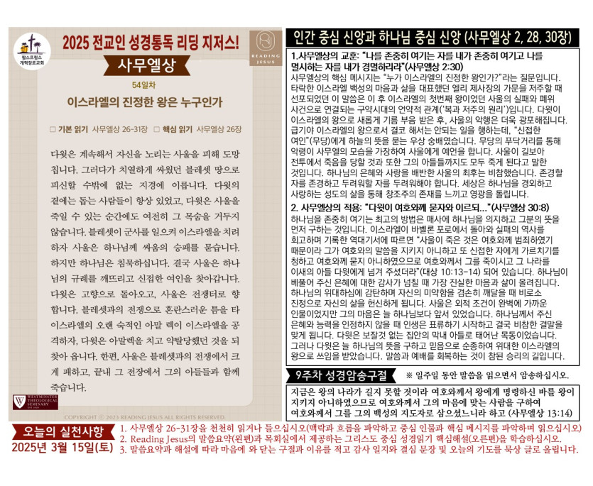 할렐루야! 2025년 전교인성경통독 리딩 지저스 제54일차 3월 15일(토) 말씀은 사무엘상 26-31장입니다.