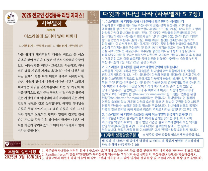 할렐루야! 2025년 전교인성경통독 리딩 지저스 제56일차 3월 18일(화) 말씀은 사무엘하 5-8장입니다.