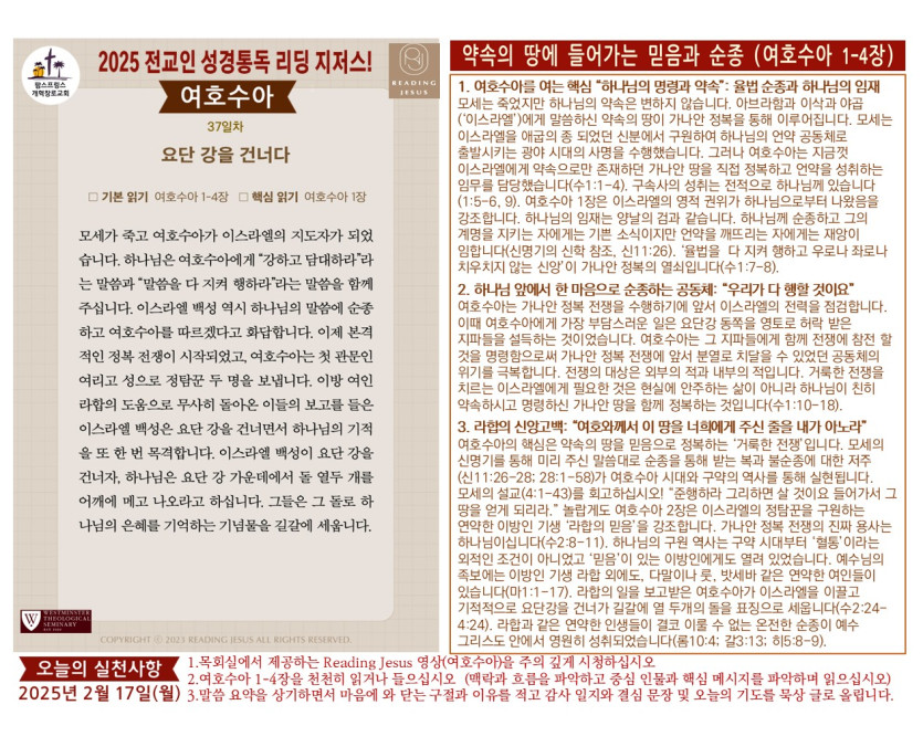 할렐루야! 2025년 전교인성경통독 리딩 지저스 제37일차 2월 24일(월) 말씀은 여호수아 1-4장입니다.