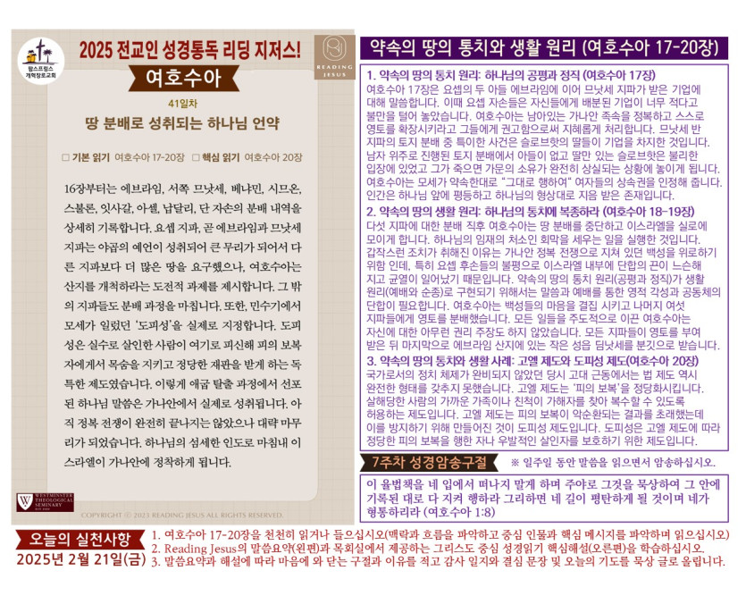 할렐루야! 2025년 전교인성경통독 리딩 지저스 제41일차 2월 28일(금) 말씀은 여호수아 17-20장입니다.