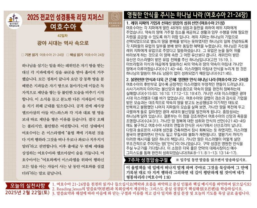 할렐루야! 2025년 전교인성경통독 리딩 지저스 제42일차 3월 1일(토) 말씀은 여호수아 21-24장입니다.