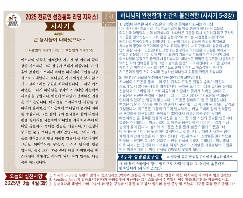 할렐루야! 2025년 전교인성경통독 리딩 지저스 제44일차 3월 4일(화) 말씀은 사사기 5-8장입니다.