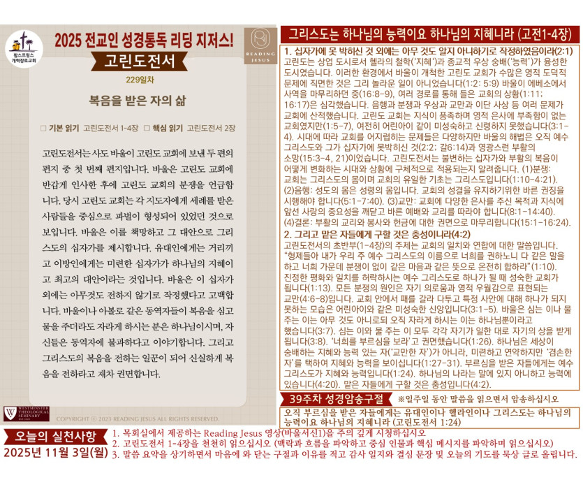할렐루야! 2025년 전교인성경통독 리딩 지저스 제229일차 말씀은 고린도전서 1-4장입니다.