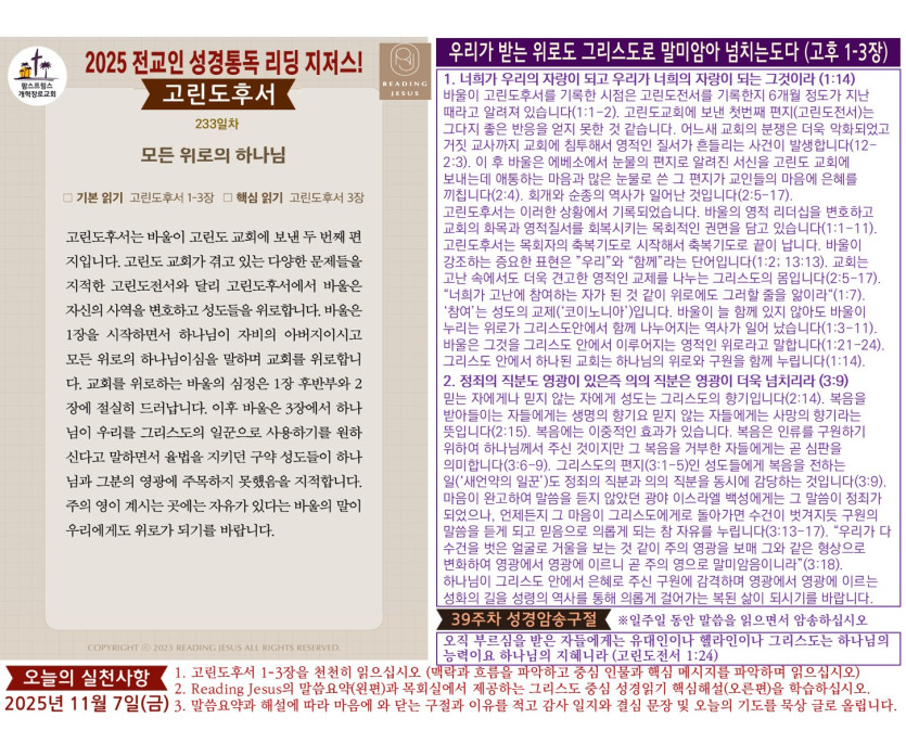 할렐루야! 2025년 전교인성경통독 리딩 지저스 제233일차 말씀은 고린도후서 1-3장입니다.