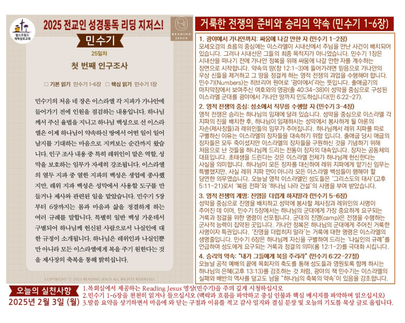 할렐루야! 2025년 전교인 성경통독 리딩지저스 제25일차 2월 3일(월) 말씀은 민수기 1-6장입니다.