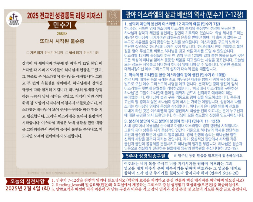 할렐루야! 2025년 전교인 성경통독 리딩지저스 제26일차 2월 4일(화) 말씀은 민수기 7-12장입니다.