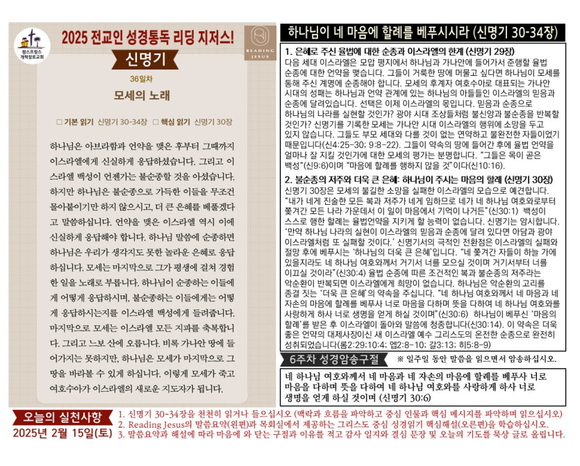 할렐루야! 2025년 전교인성경통독 리딩 지저스 제33일차 2월 15일(토) 말씀은 신명기 30-34장입니다.
